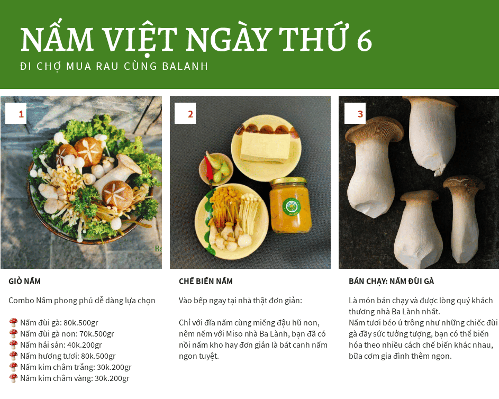 Cùng với combo rau, Ba Lành vẫn cố gắng duy trì Nấm Việt các loại và đậu hũ để chị em có thêm món cho cả nhà thật phong phú nhen.
