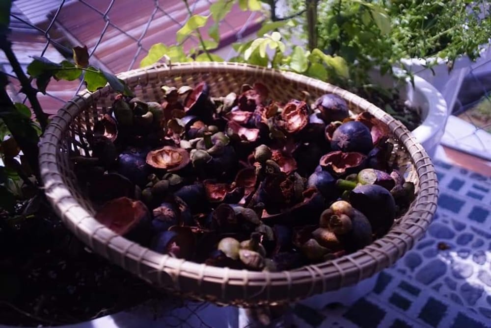 Ví như trái măng cụt này nhé. Vườn tự ủ phân từ phân dê, mùn dừa nhé, cỏ cắt máy rồi tủ gốc nhé, đâu có kết bạn với phân thuốc hoá học. Rồi một trái măng cụt đâu phải ăn mỗi phần thịt trắng ngần ấy, vỏ đem phơi khô nè, lỡ nhà có ai bị tiêu chảy, kiết lị đem sắc nước uống đỡ nha.
