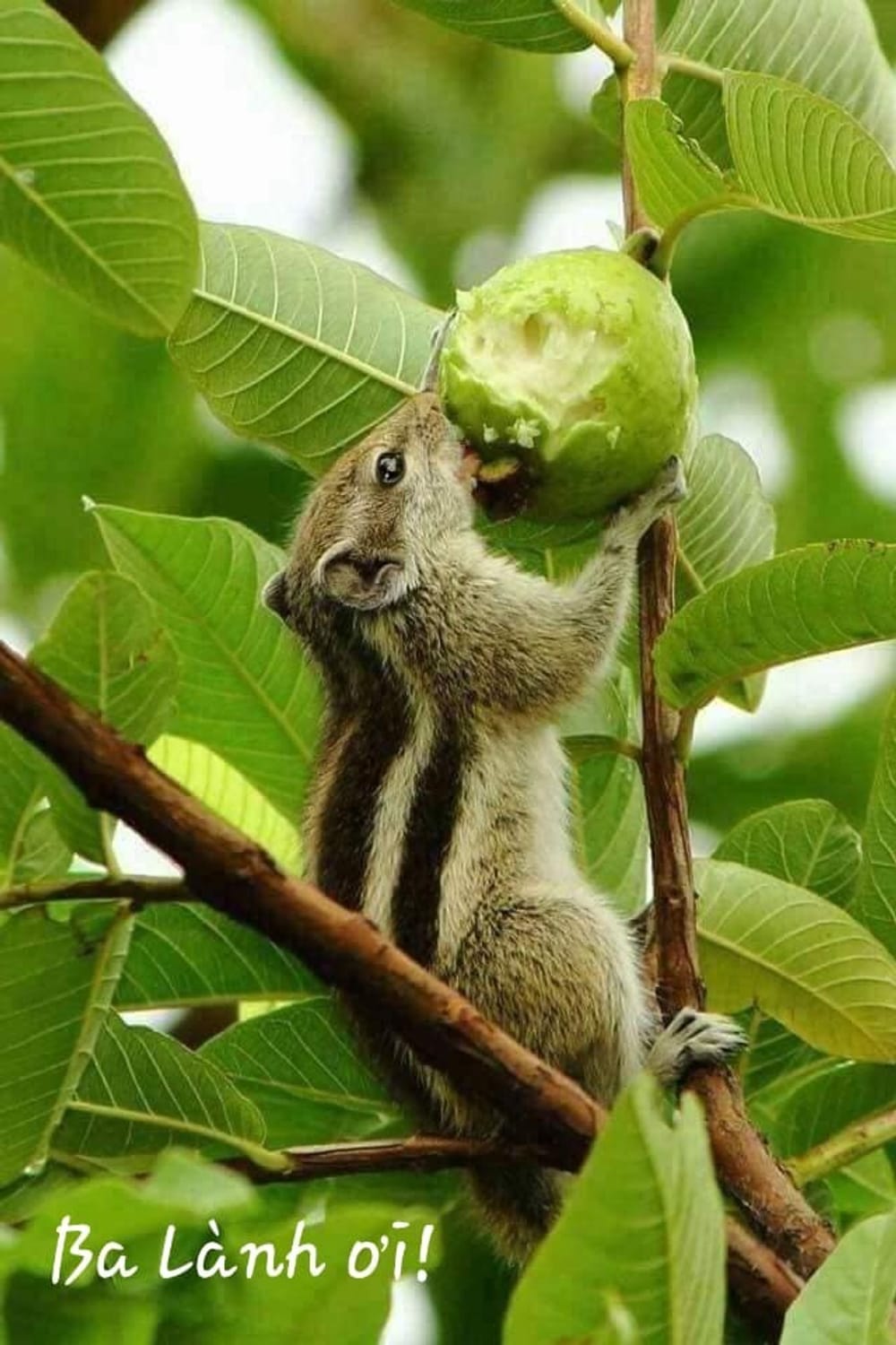 Sáng ra thấy tấm hình này yêu không tả nổi. Coi cái miệng nhai rau ráu, coi 2 bàn tay nâng trái ổi ăn ngay trên cành sung sướng chưa kìa. Anh Sóc ơi, mong anh "hạ khẩu lưu tình", ăn sương sương thôi để chúng em còn đem về Sài Gòn đặng phục vụ bà con nha.